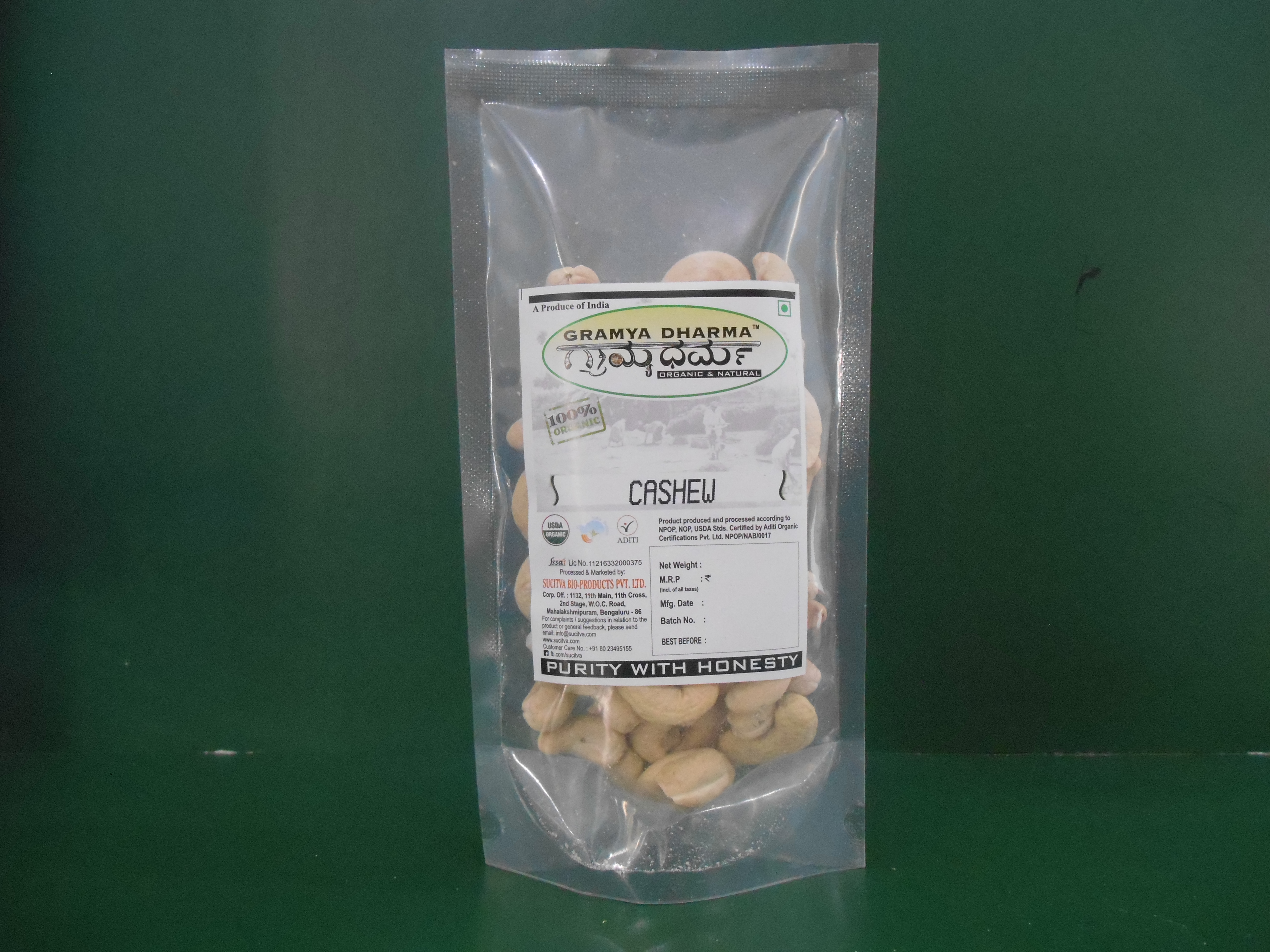 Product produced and processed according to NPOP, NOP, USDA studs. Certified by Aditi Organic